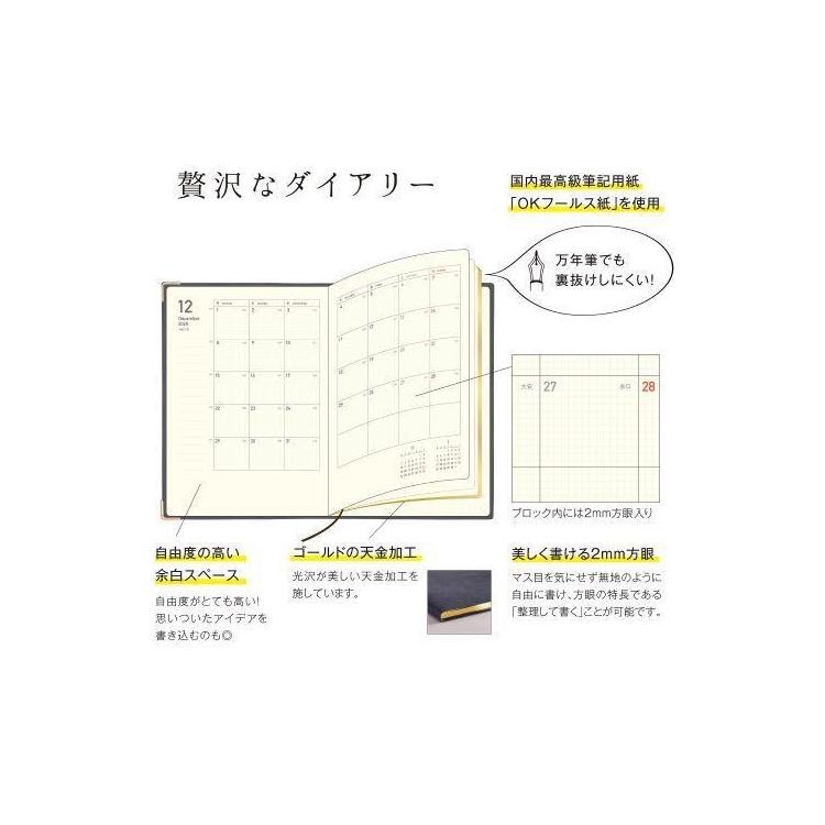 トレンドカラーの上質なカバーにコーナー金具、中身は「OKフールス紙」×「2mm方眼」、光沢が美しい天金加工とまさに贅沢な仕様。