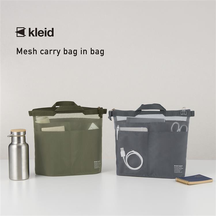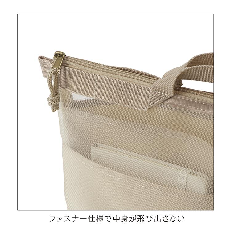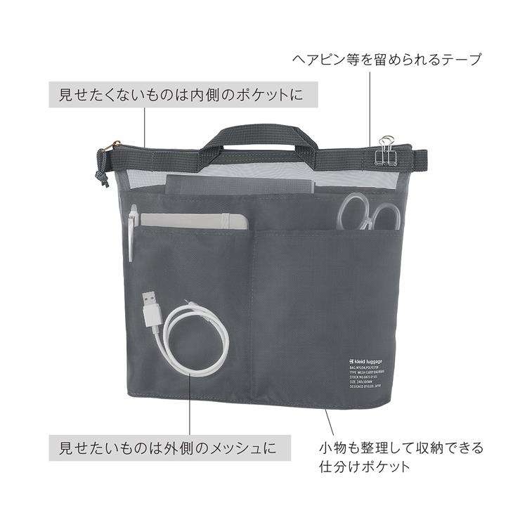 見せたいものをメッシュ(外側)に、見せたくないものをポケット(内側)に使い分けて収納する「Mesh carry(メッシュキャリー)」シリーズ・バッグインバッグ。