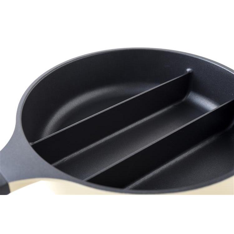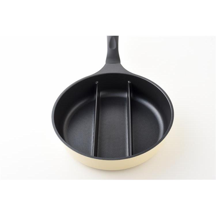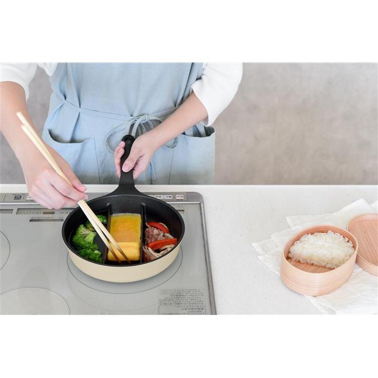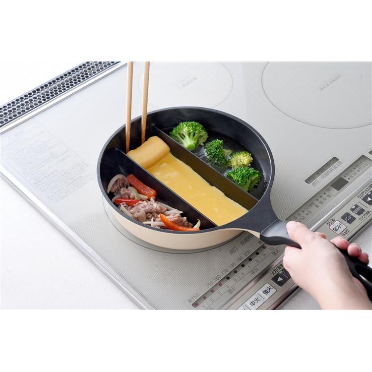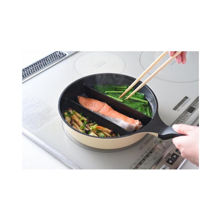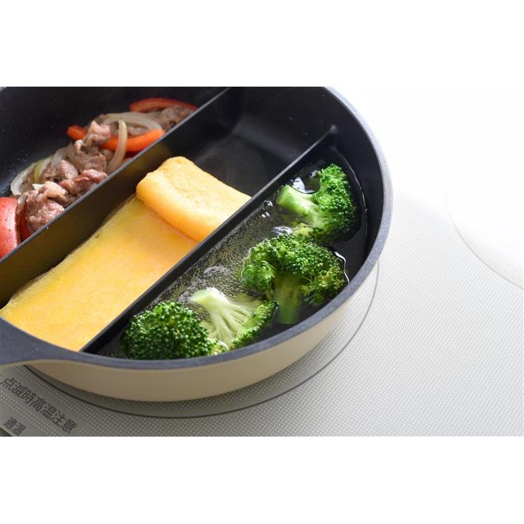 フライパンサイズは20cmの小ぶりで、仕切りの高さが3cmなので、汁物が隣に移りにくく茹でることもできます。