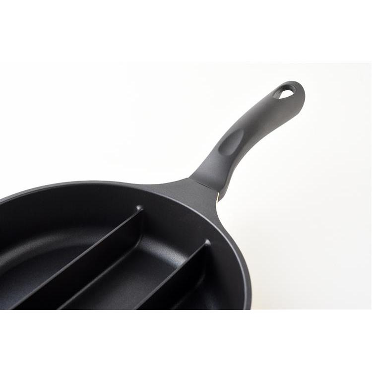 焼き場所が3つあるフライパンで、まん中は卵1個で玉子焼きを作るのに適した幅の5.5cmでお弁当にちょうどいいサイズです。