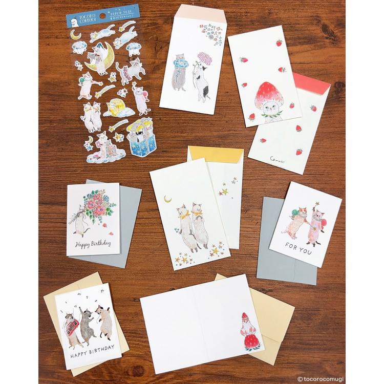 イラストレーターのトコロコムギさんが描く、ゆるくて表情や姿がとても愛らしい動物“コムギアニマル”のバースデーミニカードです。お花を持った猫たちがお祝いの気持ちを届けてくれます。絵柄表面のツヤ加工もポイント!
