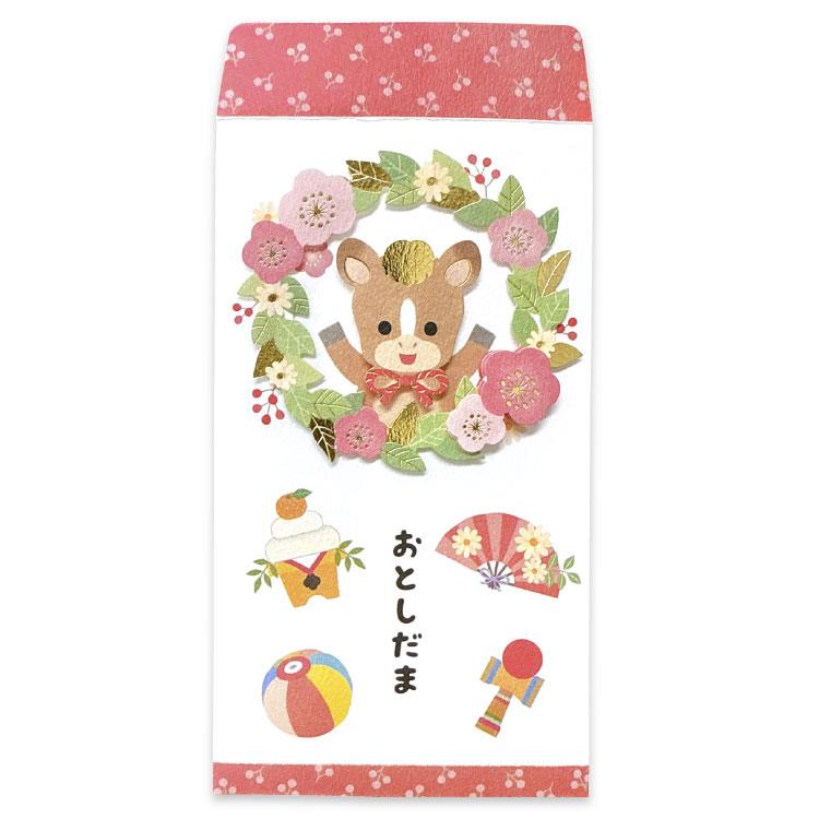 紙パーツなどの部材を貼って立体感を出した、可愛らしいウマのハンドメイド年賀ぽち袋です。