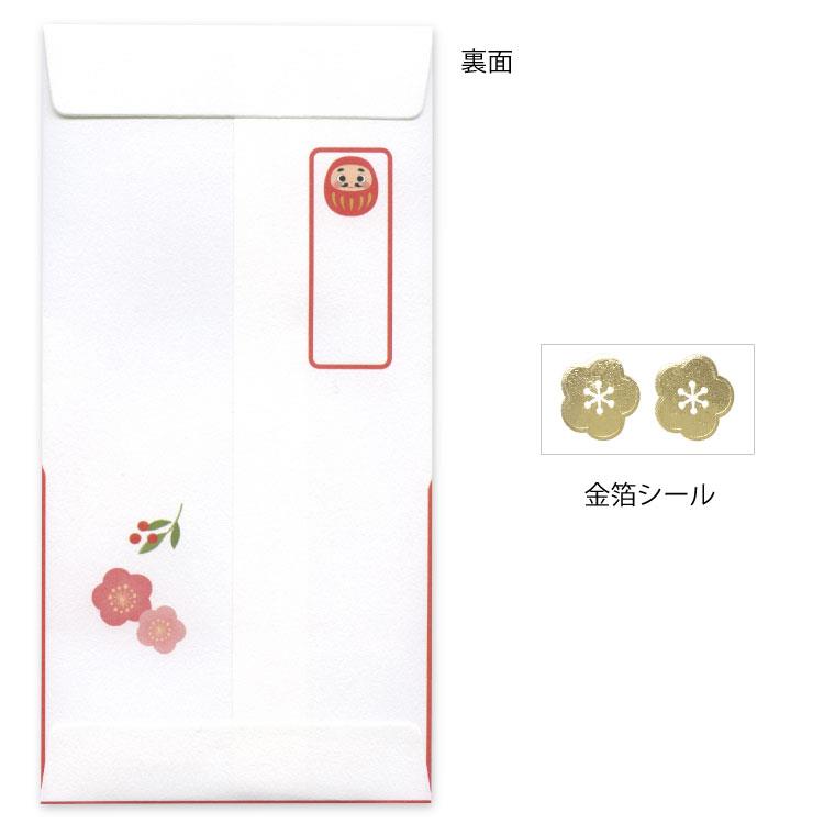 紙パーツなどの部材を貼って立体感を出した、可愛らしいウマと達磨のハンドメイド年賀ぽち袋です。