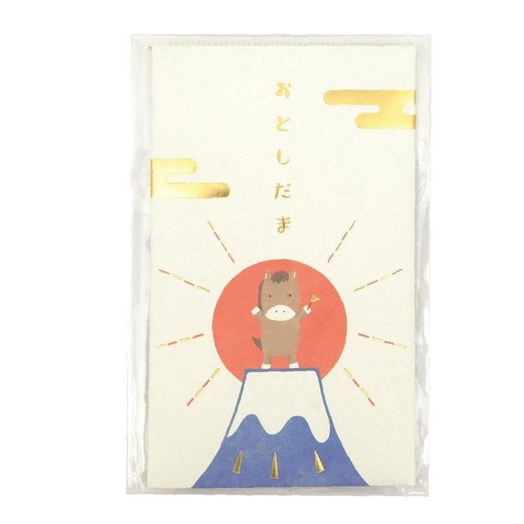 朝日を背に富士山の頂上に立つ、可愛い午のイラストのおとしだま袋。