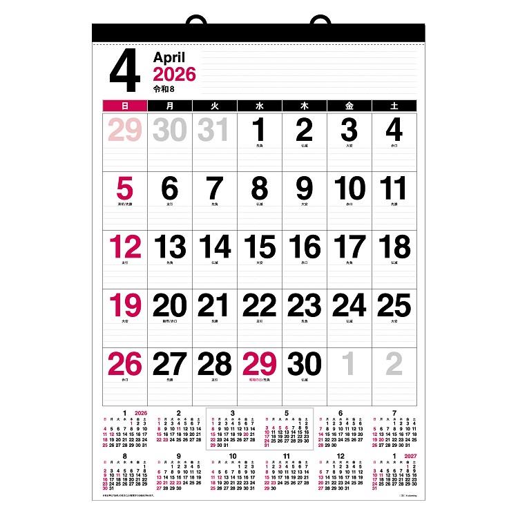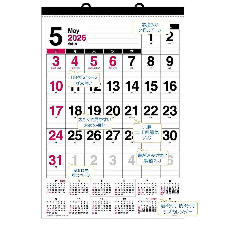 文字が大きくはっきり見える縦型の大判壁掛カレンダーです。