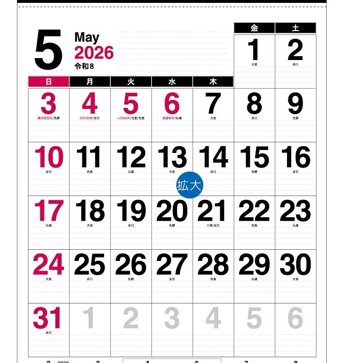 縦型大判サイズの実用的な数字カレンダー