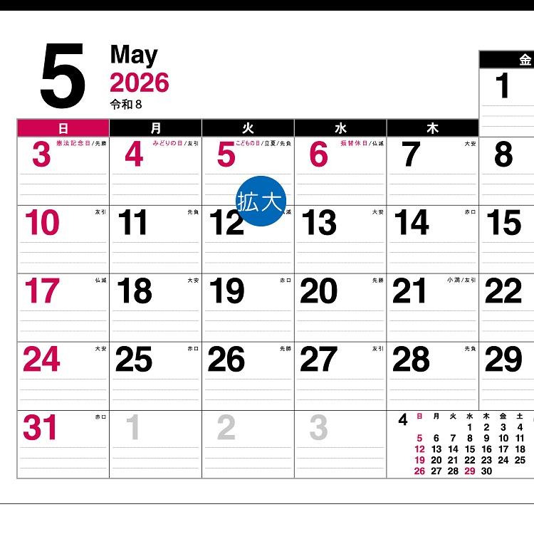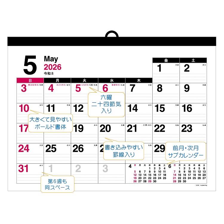 日付数字は太くて見やすいボールド書体を使用した実用カレンダーです。