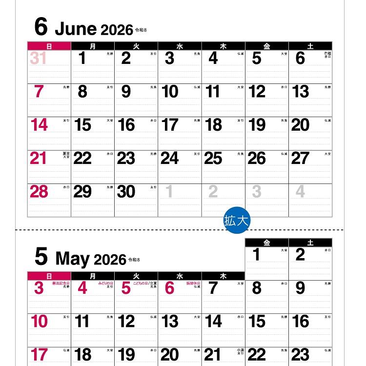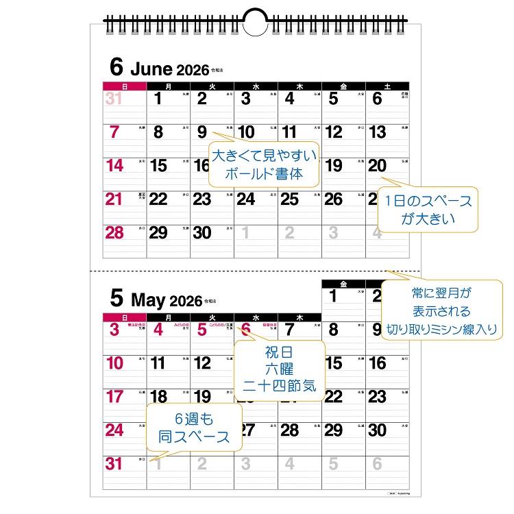 1ヶ月に6週ある月も各日付のスペースは同じサイズの記入スペースになるようにデザインされているシンプルで非常に使いやすいカレンダーです。