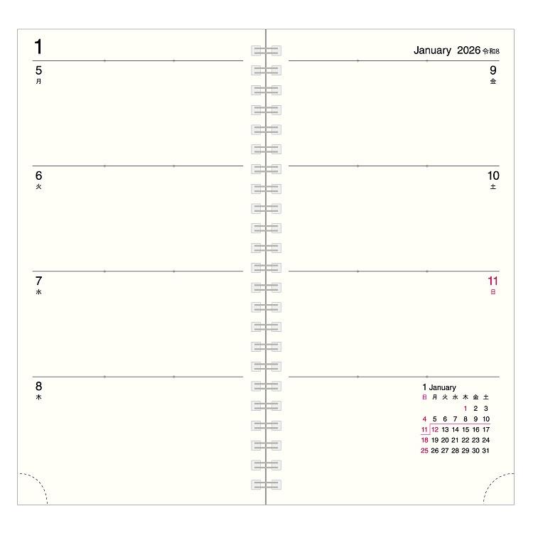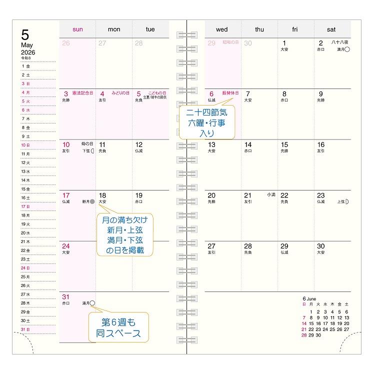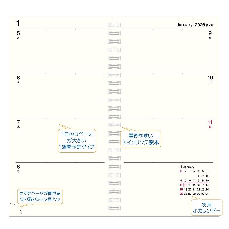 週間(見開き1週間・ホリゾンタル式)+月間(ブロック)タイプです。