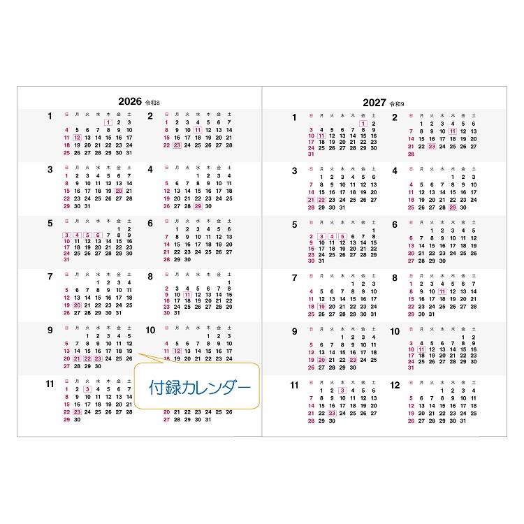 月毎のインデックス付で開きやすく六曜、二十四節気入り。耐久性のある厚めの用紙を使用。