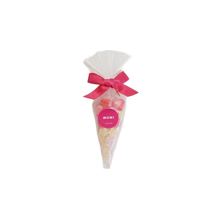 リボンに合わせた「赤とピンクのハート」が入った、かわいくておいしい推しカラーキャンディです。