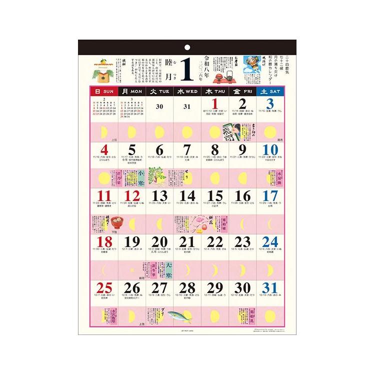 毎月、二十四節気・七十二候・月の満ち欠け・その月の暦のイラストが描かれた情報満載のカレンダーです。