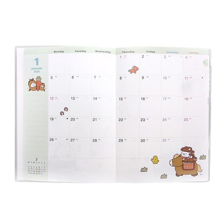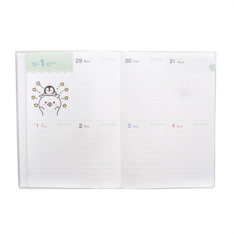 月間スケジュールとメモページに、ねこくんとぺんちゃんのかわいいイラストが描かれています♪