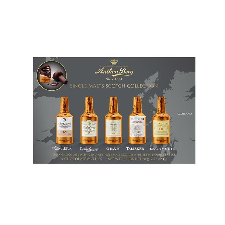 シングルトン、ダルウィニー、オーバン、タリスカー、ラガヴーリンの5種類のシングルモルトスコッチウィスキーをダークチョコに閉じ込めました。