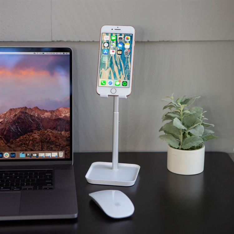 机やテーブルの上にスマートフォンやタブレットを置いて、快適な高さで使用できるように設計された頑丈なスタンドです。内蔵されたトレイは、イヤホンやUSBケーブル、オフィスの小物を入れるのに便利です。