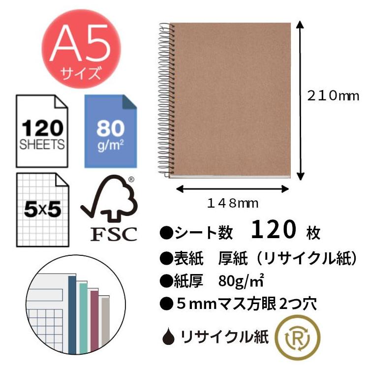 A5サイズ。リング綴じ仕様。本文は5mm方眼タイプです。
