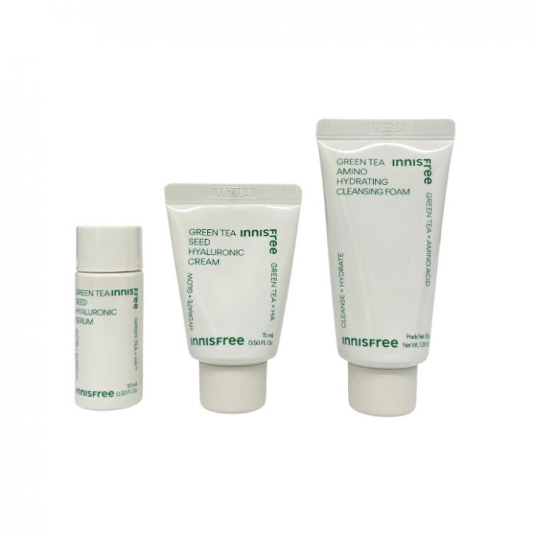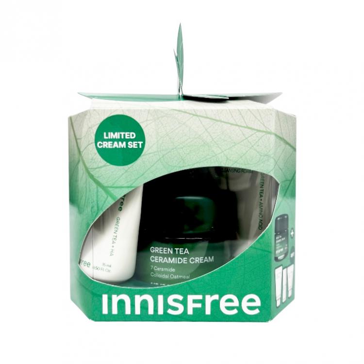 グリーンティー セラミド バリア クリームに、グリーンティーラインの洗顔料と導入美容液、水分クリームのサンプルがついたお得なセット。