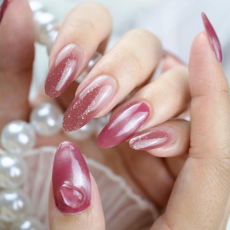 赤みを帯びたパープルのグラデーションが果汁のような深みを演出し、ゴールドグリッターが陽射しに輝く果皮を表現。