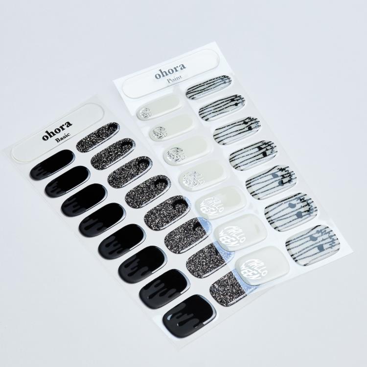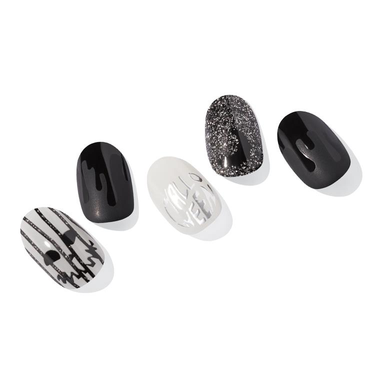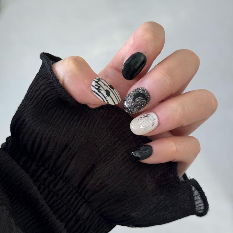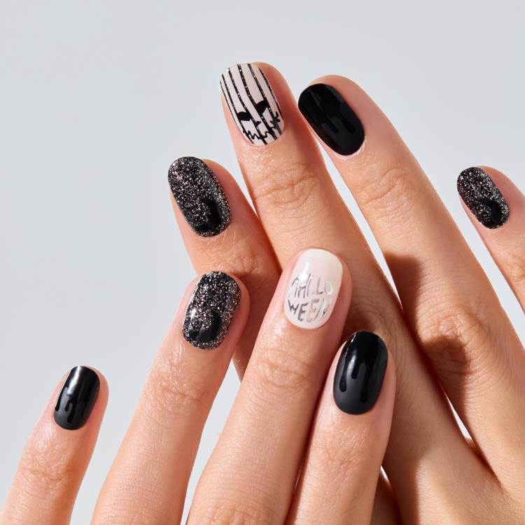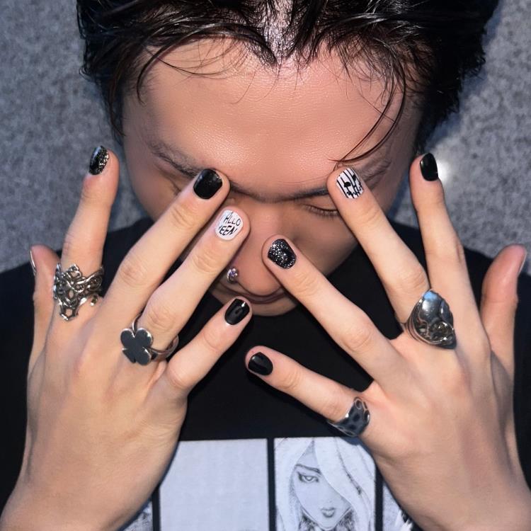 ブラックのゴーストを全体のベースにし、マットな質感とグリッター、レタリングなど感覚的な要素を多彩に組み合わせたネイルデザイン。