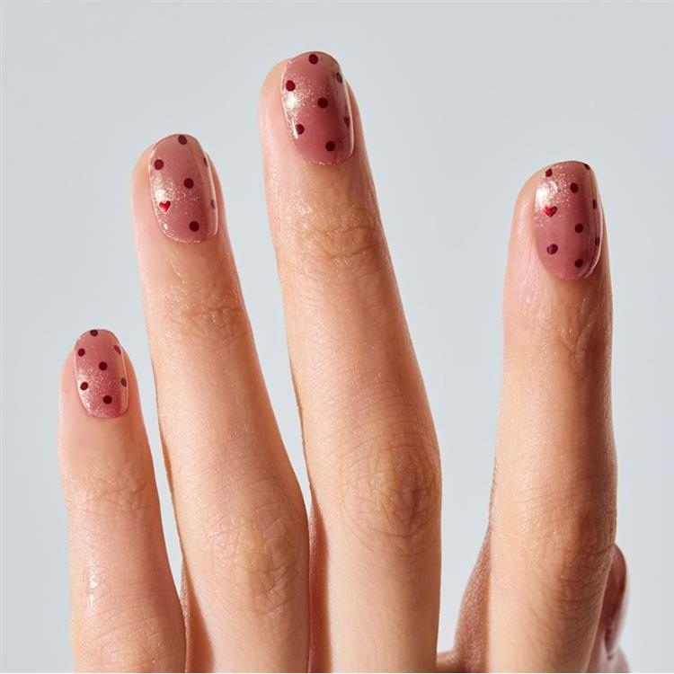 バーガンディのドットパターンにプラスしたハートが、さりげなくキュートなアクセントに。