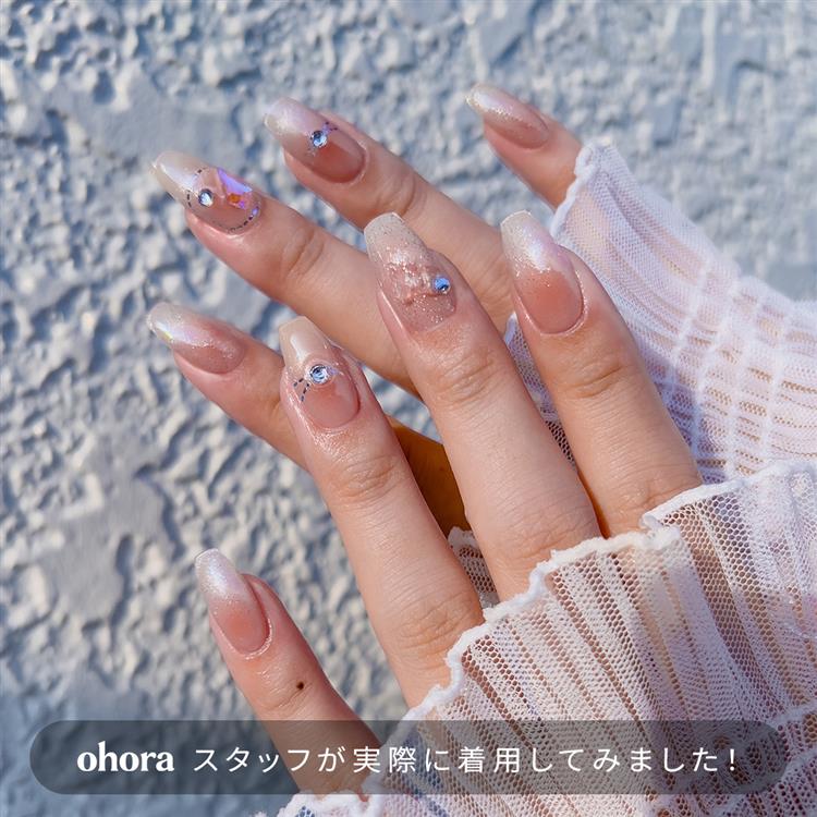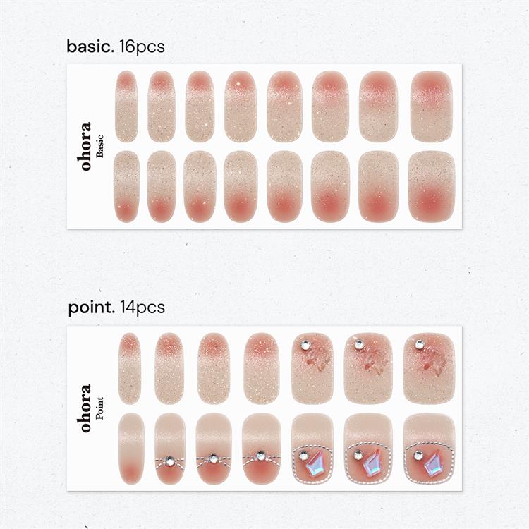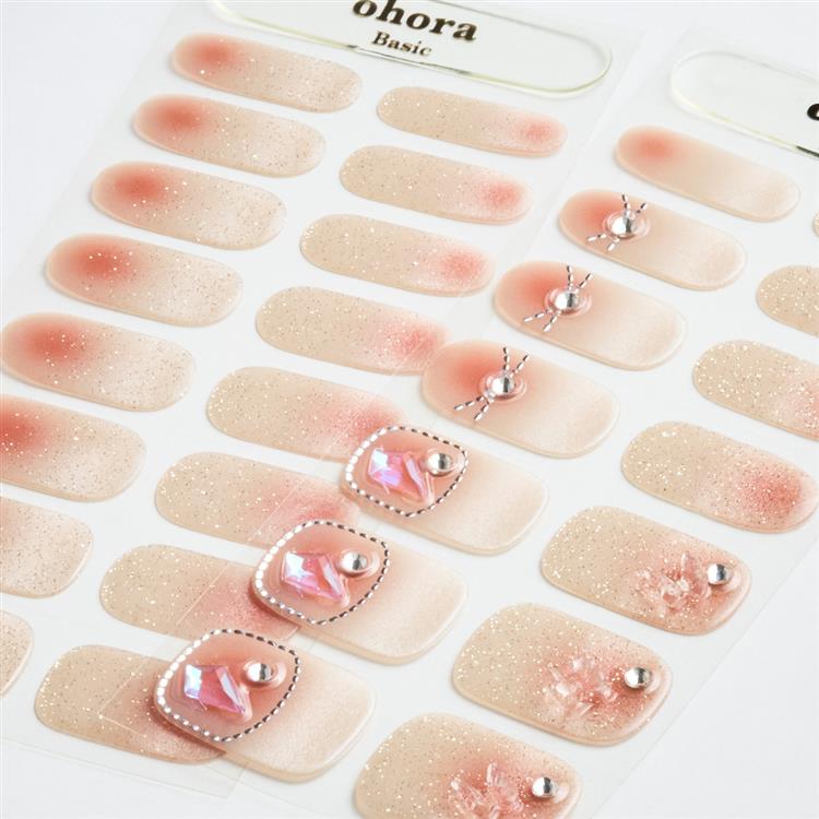 光を含んだかのようにほんのり輝くローズカラーのグラデーションに、細かいプラチナグリッターを加え、陽ざしの下でほのかに染まった頬のような愛らしいムードを表現しました。