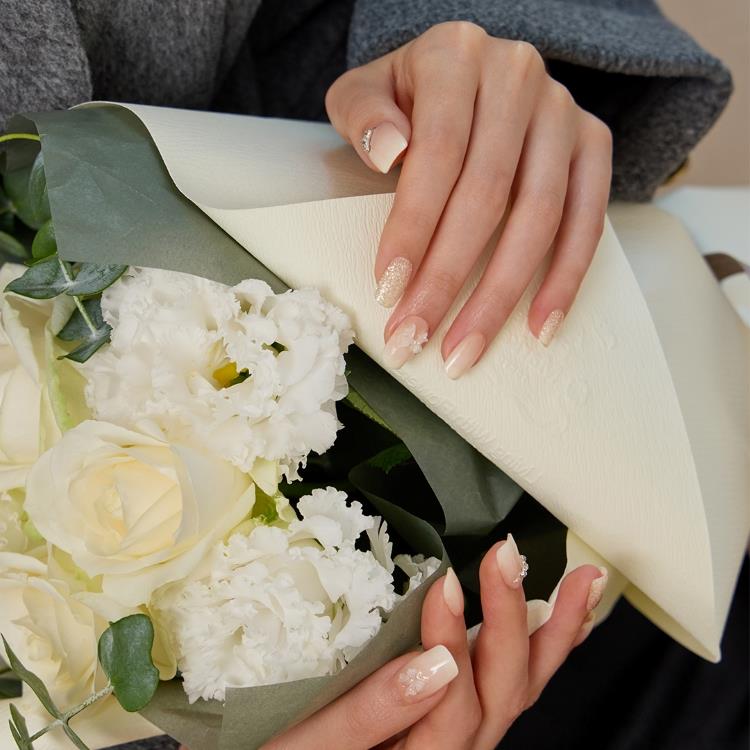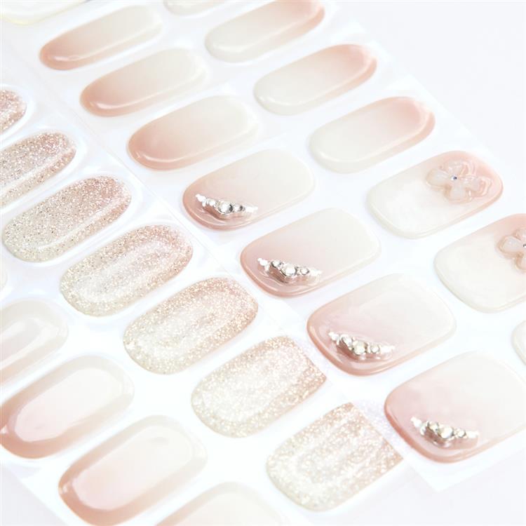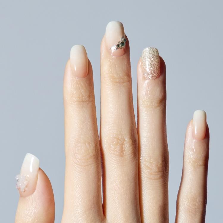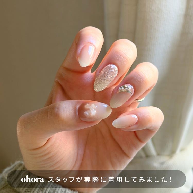 グリッターグラデーションが華やかさと優雅さを添え、フレンチの上にあしらったオーロラリボンが洗練された感性を引き立てます。