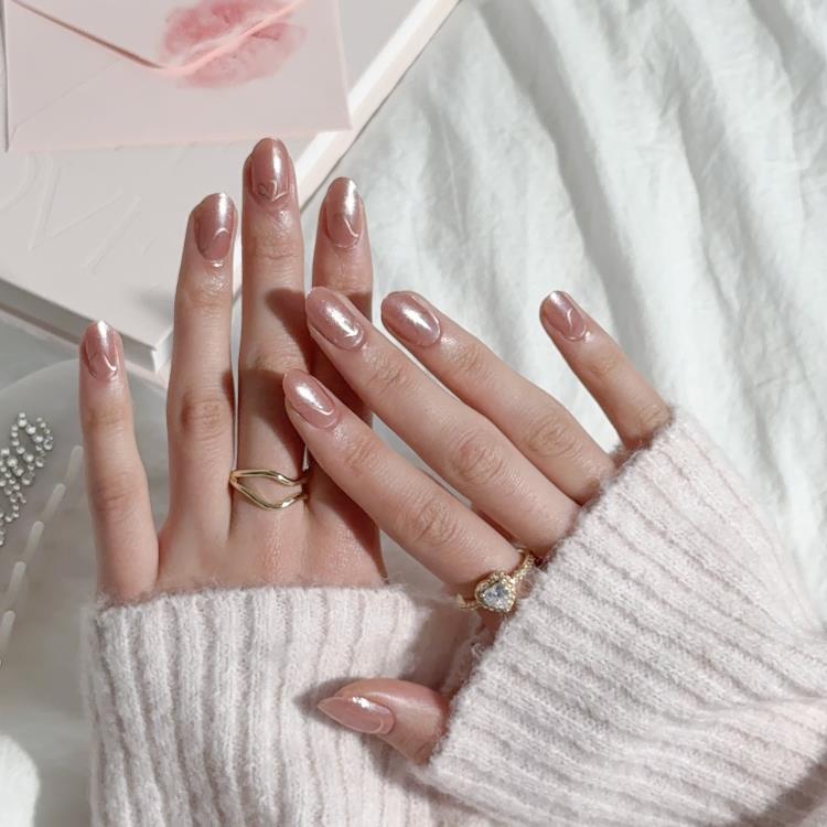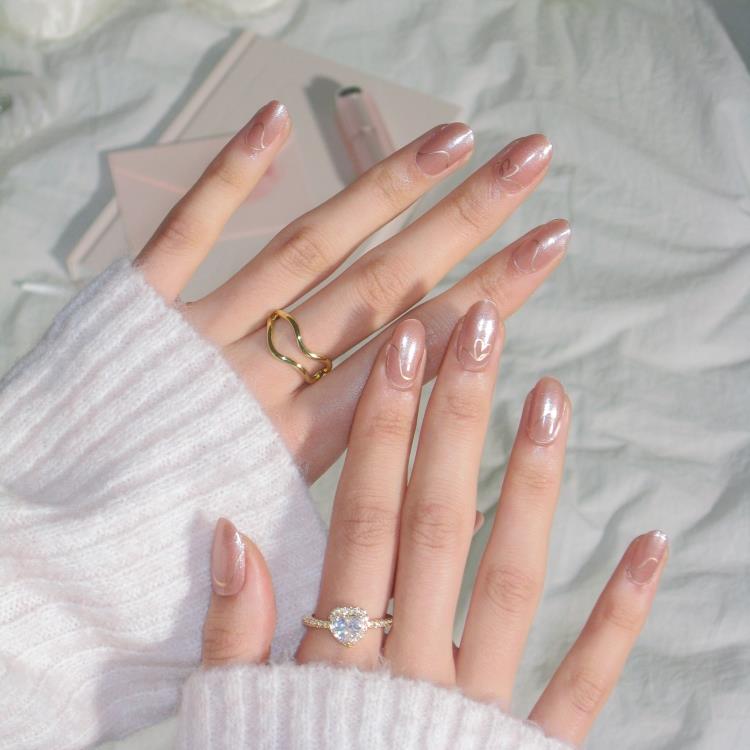 ロージーピンクネイルに、ローズピンクの筆タッチマーブルを施し、上品な輝きのアクセントをプラス。