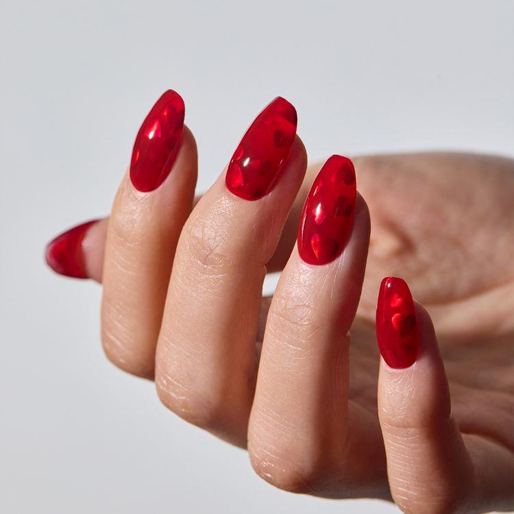 落ち着いた定番のレッドネイルにハートモチーフを加え、