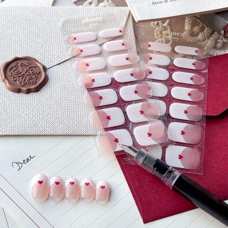 2.爪のサイズに合うシールを選び、透明フィルムをはがしてキューティクルラインから少し間隔を空けて貼る。爪の端までていねいにフィットさせる