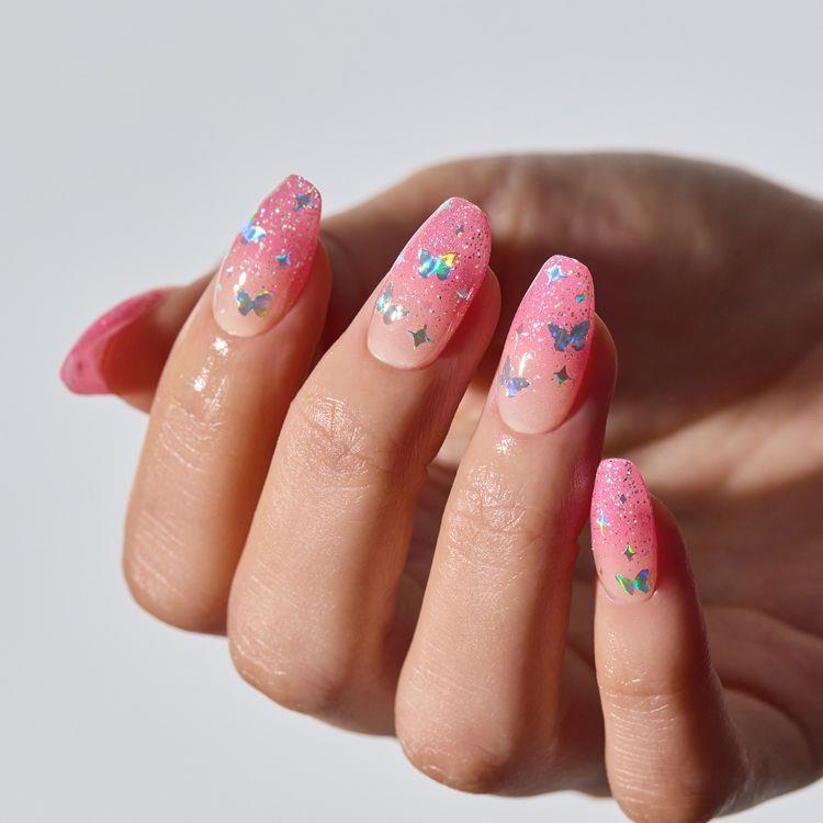 ピンクベースにホログラムミラーやシェル・ピンクホイル・蝶モチーフをあしらった、
