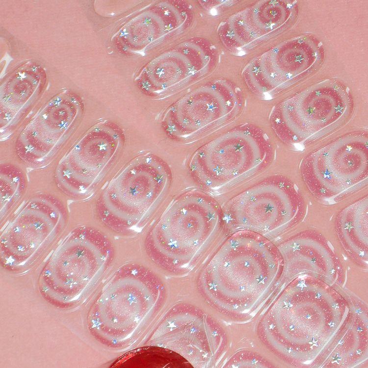 2.爪のサイズに合うシールを選び、透明フィルムをはがしてキューティクルラインから少し間隔を空けて貼る。爪の端までていねいにフィットさせる
