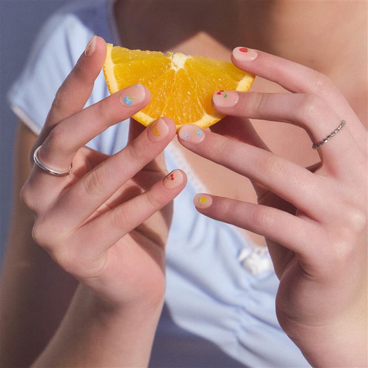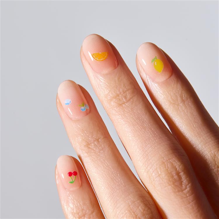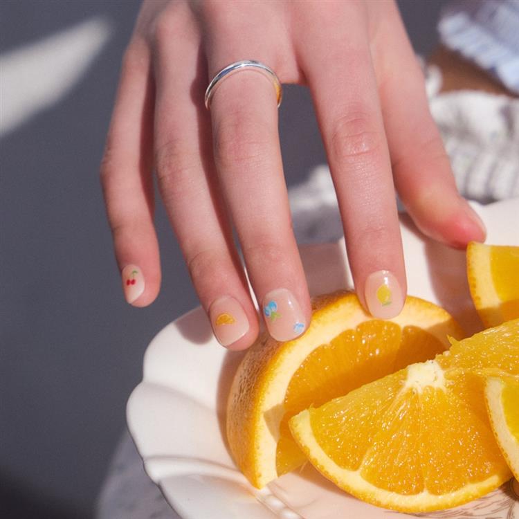 「ミルキーベース+ミニフルーツアート」のネイルで、春の指先を華やかに彩るデザインです。