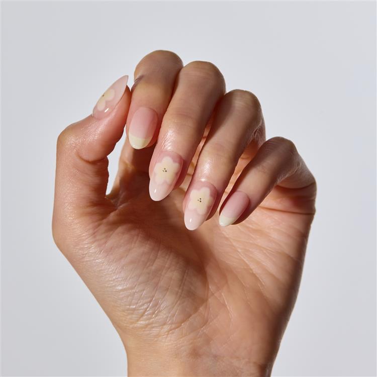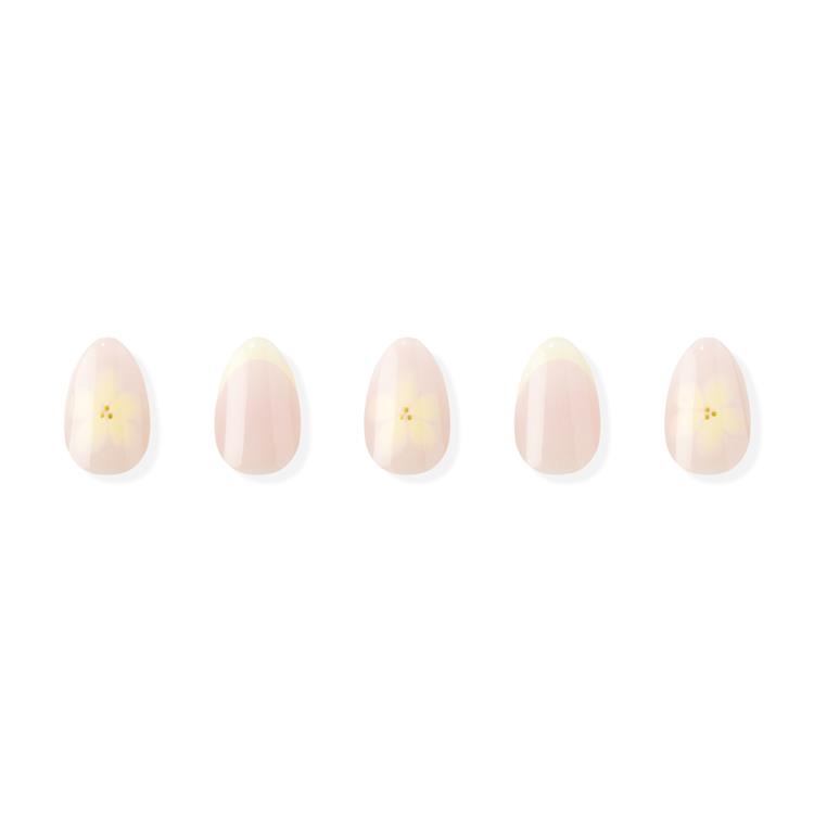 透け感のあるシロップピンクベースに、やさしく溶け込むソフトイエローのフレンチラインを重ね、春の陽だまりを思わせるイエローフラワーモチーフをポイントにあしらったデザイ。