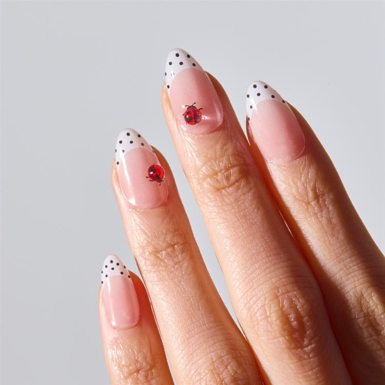 透け感のあるピンクシロップベースに、クリーンなホワイトフレンチを重ね、フレンチラインにブラックのドットをあしらった、遊び心のあるデザイン。