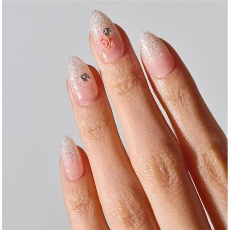 淡いピンクのグラデーショングリッターベースに、ローズモチーフとシルバーパーツをポイントであしらった、春らしいネイルデザイン。