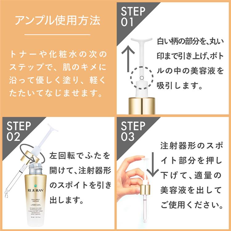 デュアルエフェクトアンプルを適量、肌のキメに沿ってやさしく塗り、なじませます。