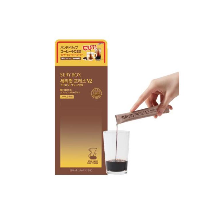 SERYBOXの「セリカットプレッソV2」は、アラビカ豆を使った香り豊かなドリップコーヒーに、食後ケアと腸内環境サポートを意識した成分を配合したスティックタイプの機能性ドリンクです。