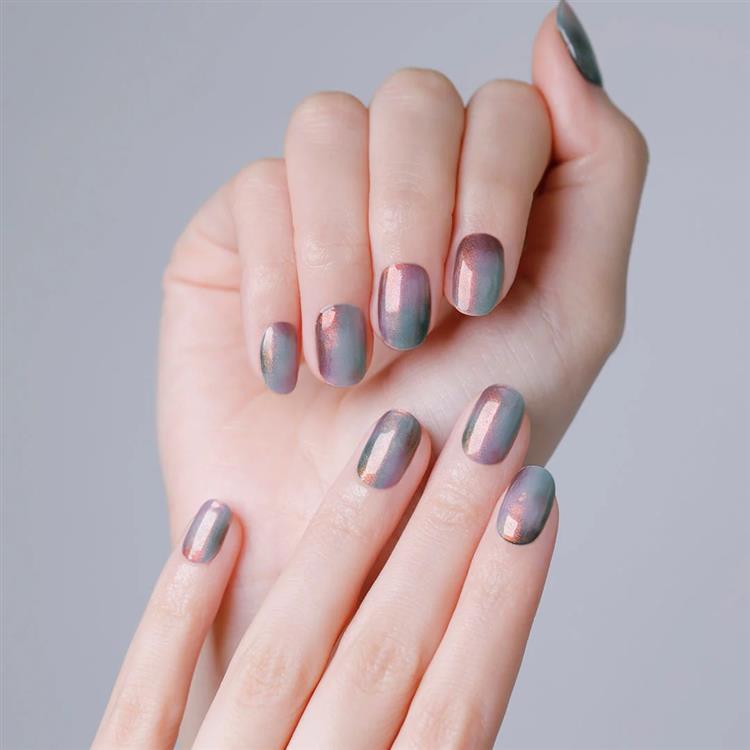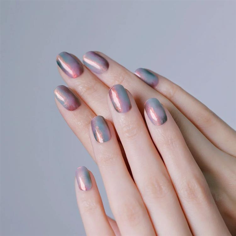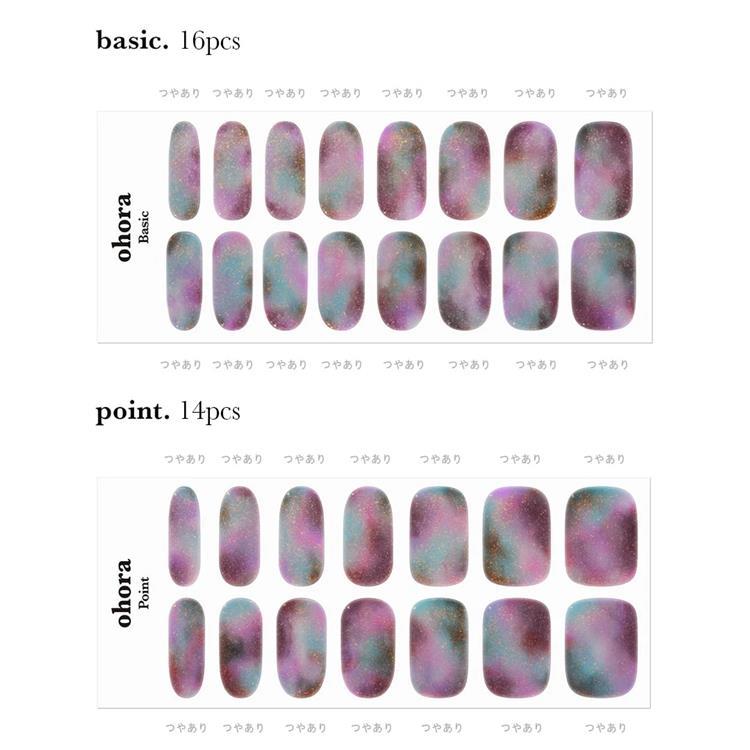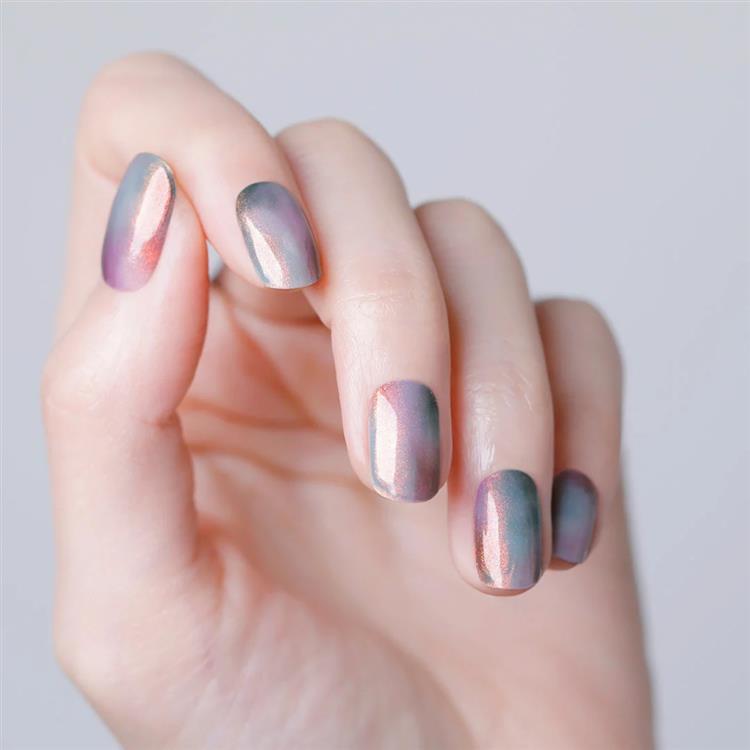 寒色と暖色を絶妙に組み合わせたマーブルネイルに、角度によって色が変化するオーロラパウダーを乗せ、多彩な色と輝きが指先を包みます。