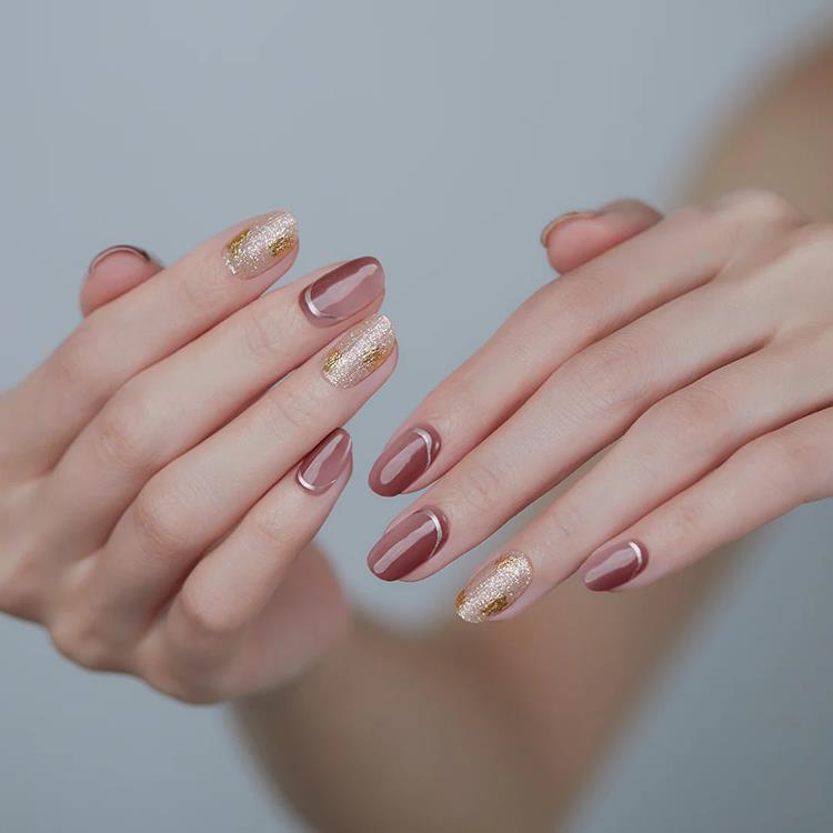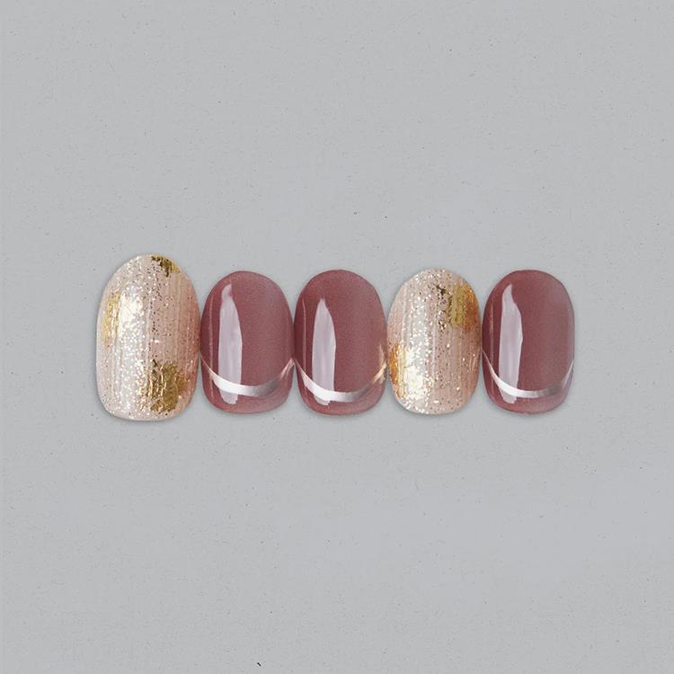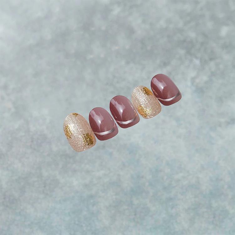 グリッターのきらめきが重なる立体感のあるパターンネイルに、指先を染めるブリックレッド、おしゃれなローズゴールドの箔など、ディティールにまで洗練さが光ります。